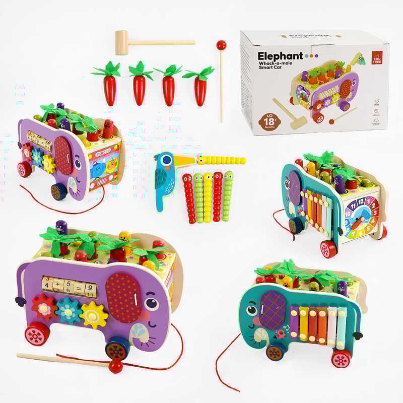 Каталка логічна C 68265 (24) дерев’яна, ксилофон, шестерні, пальчикові гра, годинник, стукавка, в коробці