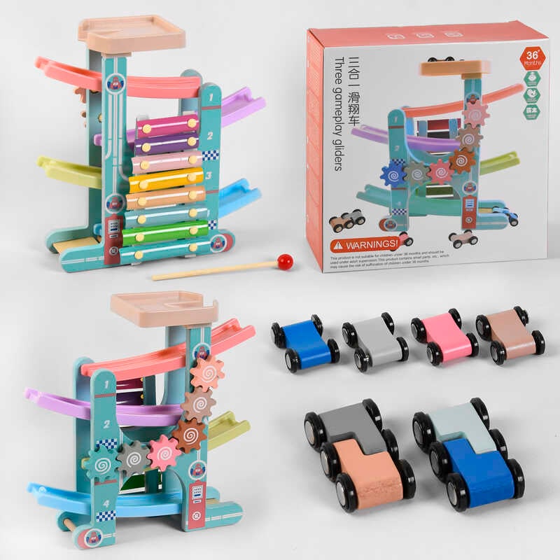 Трек C 44894 (20) дерево-пластик, 4 поверхи, 6 машинок, ксилофон, в коробці